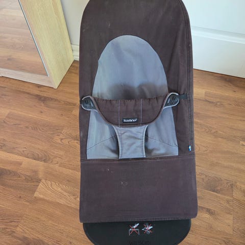 Quax Baby Bouncer / Børnelænestol med polstret betræk i lyst, blødt materiale. Stolen har en sikkerhedssele og en ramme i mørkt træ.