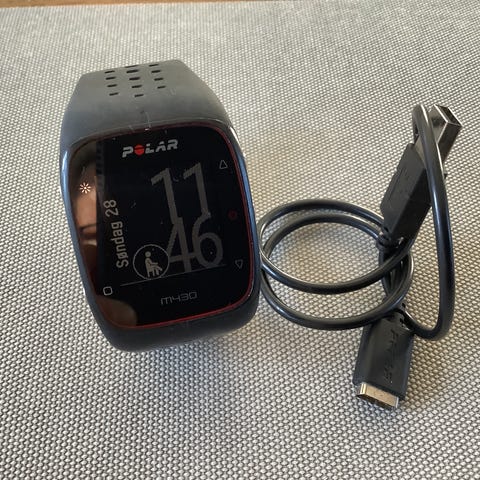 Polar M430 GPS løbeur i sort farve. Uret har indbygget GPS, pulsmåling ved håndleddet, søvnregistrering, og vibrationer til notifikationer. Det er vandafvisende og kan forbindes til Polar Flow appen til analyse og planlægning af træning. Uret leveres med opladerkabel og original emballage.