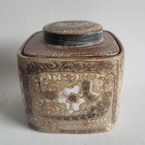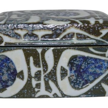 Smukt og originalt BACA-sæt fra Royal Copenhagen, designet af Nils Thorsson ca. 1968–1974. Begge dele er hånddekoreret fajance i den klassiske BACA-stil med dyb blå dekoration, organiske former og relief.