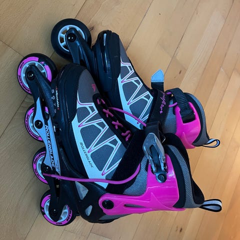 Rollerblade rulleskøjter i børnestørrelse 36. Farverne er sort og pink. Skøjterne er designet til børn og egner sig til rulleskøjtning som sport eller fritidsaktivitet.