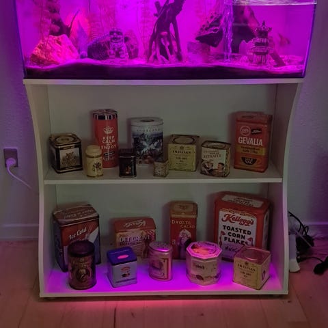 Desuden medfølger sand, rod, sten, foderautomat og foder hertil, flagefoder, weekend-foder, Malle foder, 2 net, div. børster til rensning af sten og slanger, yngelbur, , div. typer algebekæmpelse, snegle fælde, teststrimler, 2 slags medicin, vandbehandlingsmiddel, ekstra aktivt kul, ekstra pre-filter, slamsuger samt 1 guldfisk ca. 18 cm, 1 sugemalle hun ca. 25 cm, 2 sorte mollyer (hanner), 1 neonfisk, 1 kejser tetra. Alle fisk er vant til at gå uden varme-element. Akvariet er i funktion, så du kan se det er tæt.