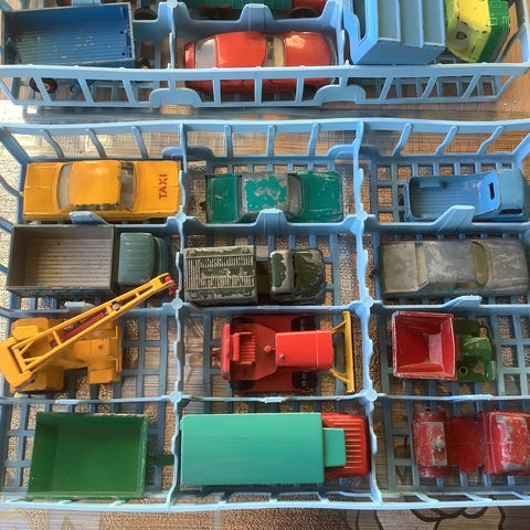 Original kuffert med biler. Et lag biler er Matchbox, et lag er blandet andre mærker. Alle er leget med. Biler fra Models of yesteryear er ikke leget med.