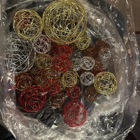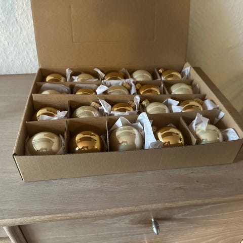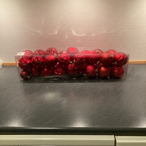 Æske med 10 julekugler og 2stk stokke og 3 stk paddehatte