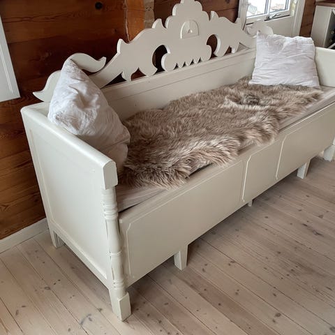 Hvidmalet fin gammel slagbænk. Slagbænken har et klassisk design med lodrette ryglænssprosser. Egnet til brug som siddeplads ved spisebordet eller i udestuen m.m. Den har desuden et stort godt opmagasineringsrum under siddepladsen. Den er malet for nogle år siden. Hynde og puder medfølger ikke. H 95 cm, D 56 cm. og B 180 cm.