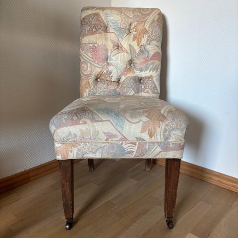 Jeg har arvet denne gamle stol, men jeg har ikk rigtig plads til den. Du kan hurtigt give den et mere moderne/retro betræk, da sædet kan løftes af (se fotos).