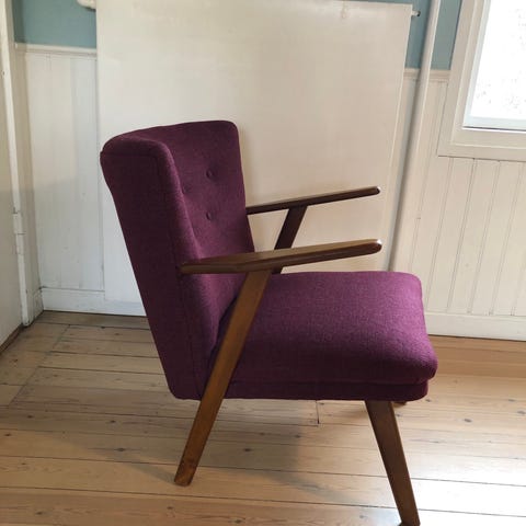 Nyeligt betrukket med bordeauxrødt møbelstof.