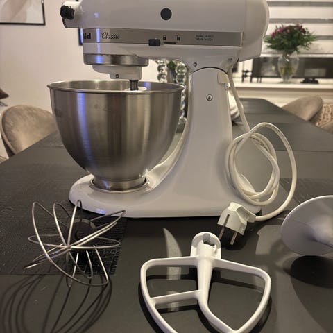 KitchenAid Artisan køkkenmaskine i grøn farve med flere ekstra rustfri stålskåle og forskellige piskeredskaber. Maskinen er fra dyr og rygefrit hjem.
