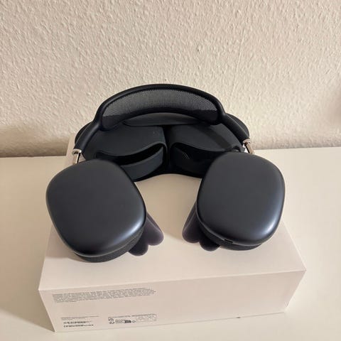 Apple AirPods Max hovedtelefoner i sort farve. Over-ear design med polstrede ørepuder og justerbar hovedbøjle. Fremstillet med materialer, der sikrer komfort.