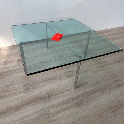 Virkelig fint sofabord i glas. Producenten hedder Knoll og bordet Barcelona - det er designet af Ludwig Mies Van der Rohe.