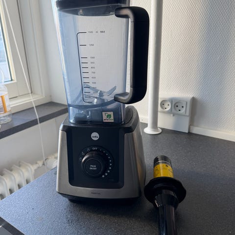 Wilfa Xplode 1500 blender med en effekt på 1500 watt. Blenderen har en kapacitet på 1,8 liter og leveres med tilbehør til blend & go funktion, herunder transportflaske. Designet inkluderer en glasbeholder og rustfrit stålelementer. Nypris på tilbud cirka 1.000 kr.