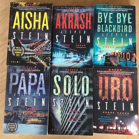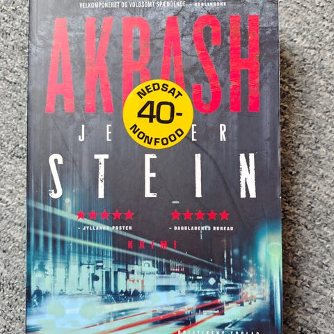 Jesper Stein Aisha og Akrash bøger. To bøger af Jesper Stein med titlerne 'Aisha' og 'Akrash'. Bøgerne har begge omslag med billeder af bymiljøer og er indbundet i paperback format.