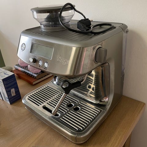 Sage Barista Pro espressomaskine i rustfrit stål med indbygget kaffekværn og digitalt display.