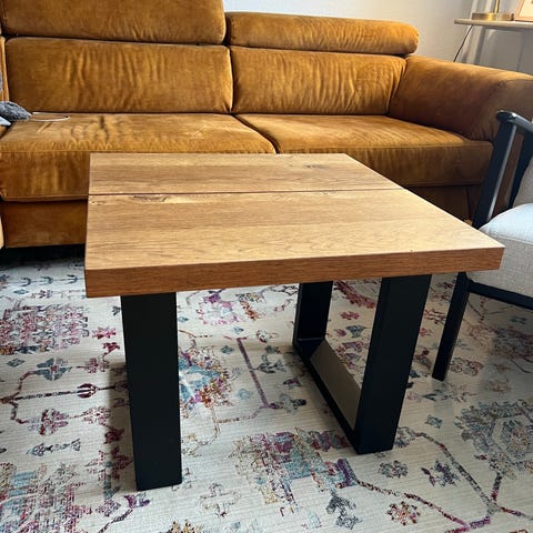 Planke sofabordi Natur eg som er matsort lakeret. Nypris kr. 4000. Vi sælger også spisebord som passer til H 75 B 100 D 220. Der følger 2 stk udtræksplader med på 50 cm, så bordet kan blive ialt 320 cm. Nypris kr. 10.000 sælges for kr 4000