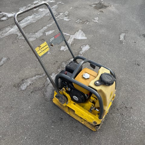 motor. Maskinen er designet til komprimering af jord og asfalt ved anlægsarbejde. Den har et robust metalchassis og håndtag til betjening.