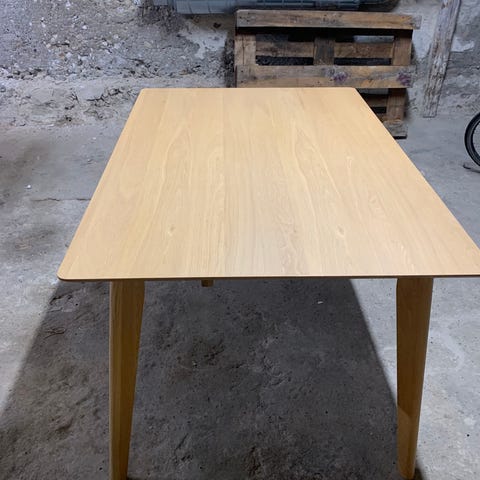 Fuldt funktionelt. Kan forlænges med cirka 100cm med bordplader som er vedhæftet under bordet. Lidt mærker hist og her som kan slibes væk.