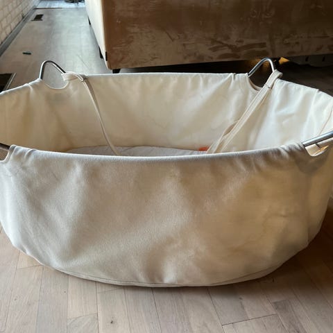 Slyngevugge brugt i meget kort tid, samlet set ca. 1 måned eller mindre og fremstår derfor som nyt og i rigtig god stand. Den er passet godt på og kommer fra et røgfrit og dyrefrit hjem.