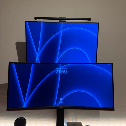 Sælger komplet arbejdsetup bestående af skærme, skærmarme og tastatur, da jeg ikke får det brugt.