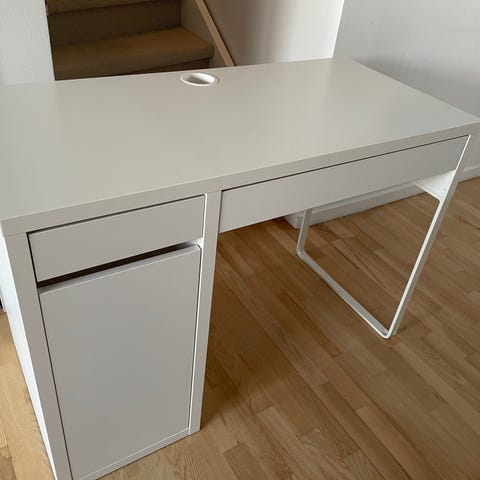 IKEA skrivebord med hvid overflade og en kontorstol med sort sæde og ryglæn. Skrivebordet har et kabelhul i bordpladen, så der nemt kan benyttes ledninger ved skrivebordet.