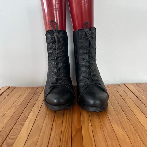 Støvler i størrelse 37, lavet af sort læder. Støvlerne har lynlås på siden for nem på- og aftagning og er designet til kvinder. Materialet er alt vejr-resistent, hvilket gør dem velegnede til brug under forskellige vejrforhold.