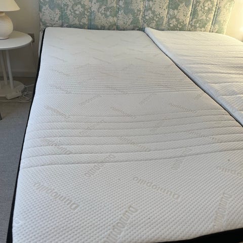 Smuk seng ned stålramme. Boxmadrasse og topmadras. 90x200. Sælges uden puder og sengetæppe.