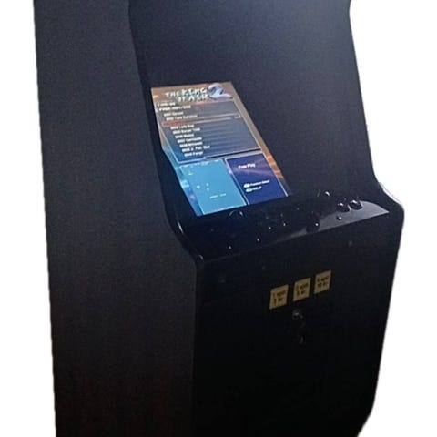 Andet arcade spilleautomat med træfinish og klassisk joystick- og knapkontrol. Enhed med skærm til visning af spil og indbygget møntindkast. Egnet til retro gaming og arkadespiloplevelser mere end 50 spil herunder Pacman, Spaceinvaders og pinball
