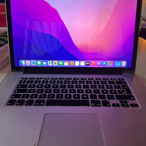Apple MacBook Pro Retina 13-tommer laptop med 2,7 GHz Dual-Core Intel Core i5 processor, 8 GB 1867 MHz DDR3 RAM, Intel Iris Graphics 6100 med 1536 MB hukommelse, og 256 GB SSD lagerplads. Farve: grå. Model fra begyndelsen af 2015.