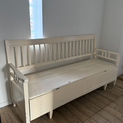 Gammel slagbænk malet i mint/lyseblå den er solid, stabil og med plads til god opbevaring. Den måler 185 x 48 x 90 (i ryggen)