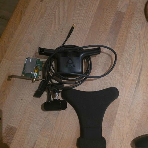 2 vive 1.0 base stations, og 3 vive 3.0 trackere.