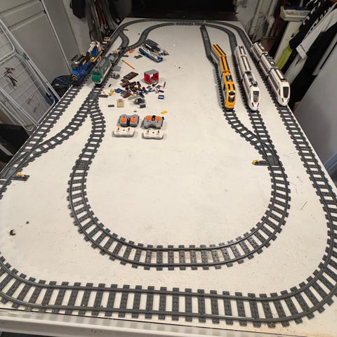 LEGO City Tog Sæt med forskellige skinner, en grøn og sort lokomotivvogn samt flere tilhørende vogne. Sættet indeholder kurvede og lige skinner til samling af togbaner. Materialet er plastik, og sættet er designet til leg og samling af tog i LEGO City temaet.
