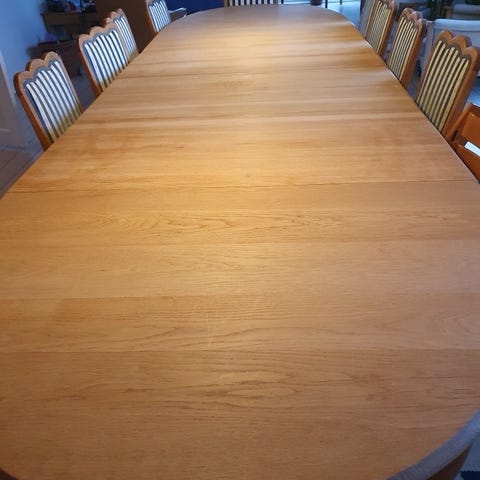 Egetræs bord med 8 stole.
