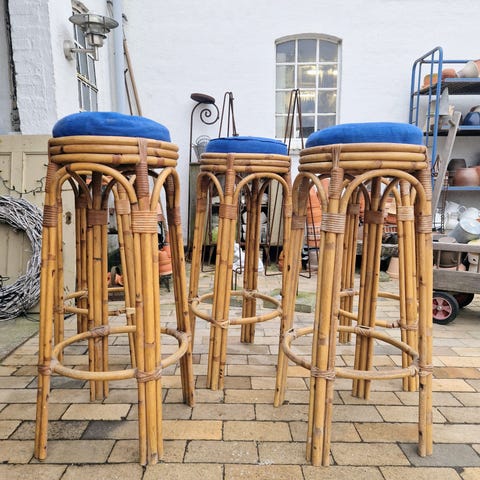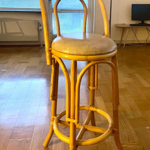 2 stk fede retro barstole fra 1980' erne - med stof betræk ( løse stofbetræk og originale betræk under ) - lys bambus - alm aldersbetingede brugsspor forekommer- ellers flot stand- måler Ca 75 cm I højden inkl sæde . Sælges samlet. Kan afhentes på adressen