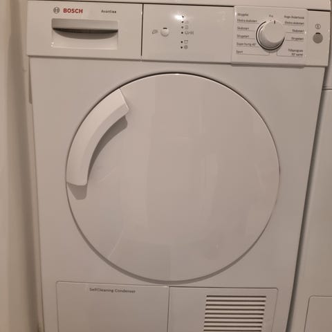 Bosch kondens tørretumbler. Maskinen er designet til at tørre tøj ved kondensation, hvilket betyder, at fugt opsamles i en beholder, som skal tømmes efter brug.