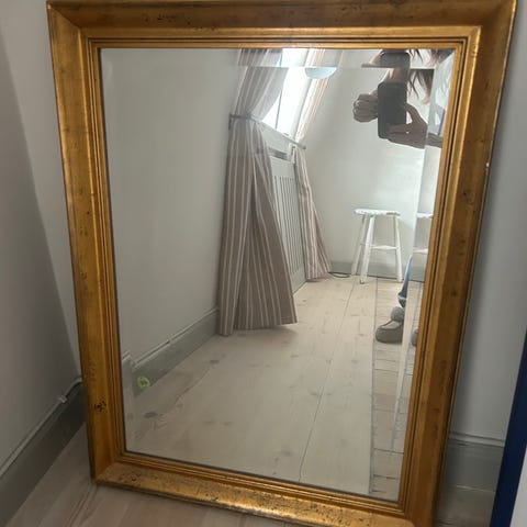 Gammelt spejl med guldfarvet ramme, mål 100cm x 190cm, sælges pga flytning. Har været i familien i mange år, men vi ved ikke hvor gammelt det er.