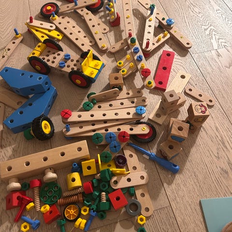 Klassisk BRIO / BILO byggesæt bestående af trædele og plastikdele i forskellige farver. Vidunderligt at bygge med! Indeholder skruer, møtrikker, tandhjul og samlingsdele til konstruktion og leg. Materialer inkluderer træ og plastik, velegnet til børn.
