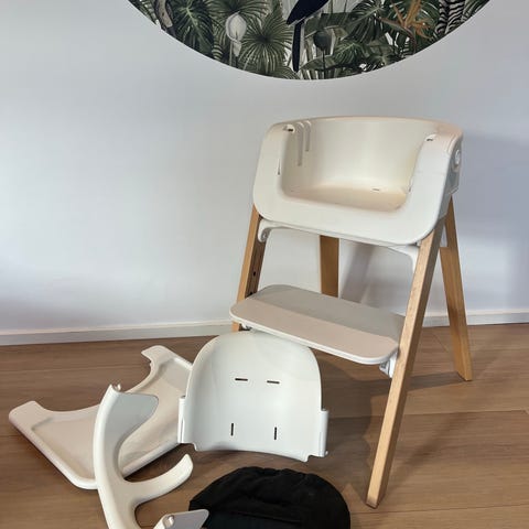 Stokke højstol i sort træ. Justerbar sidde- og fodstøtte for tilpasning til barnets størrelse. Designet til børn og kan bruges fra spædbarnsalderen med passende tilbehør.