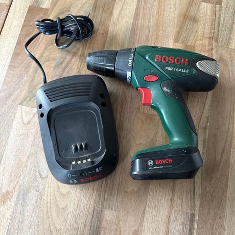 Bosch PSR 7,2V Li-2 boremaskine med batteridrevet funktion. Leveres i en grøn opbevaringskasse med tilbehør. Egnet til mindre boreopgaver og skruetrækkerarbejde.