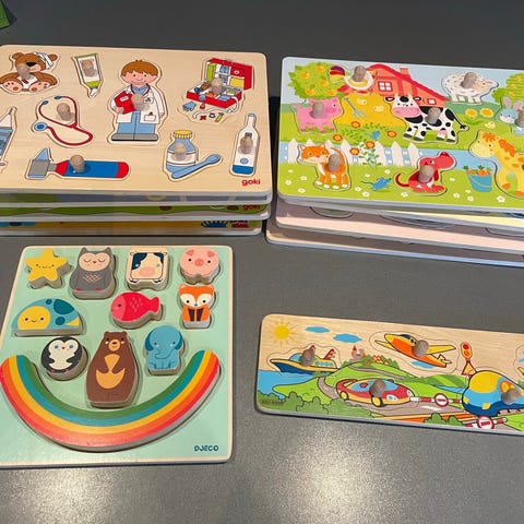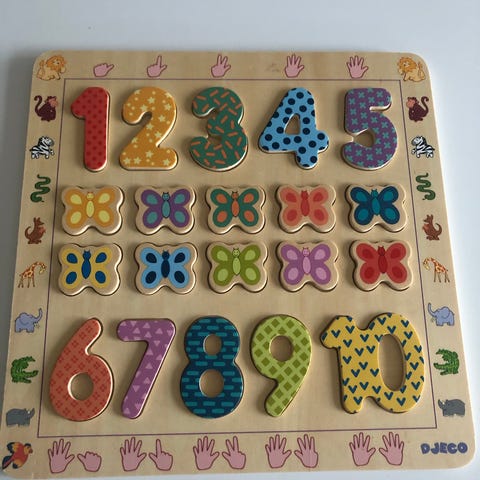 Djeco træpuslespil med figurer af afrikanske dyr, herunder løve, zebra, gorilla, ugle og kameleon. Puslespillet er lavet af træ og indeholder en plade med udskæringer til hver dyrefigur. Velegnet til børn til udvikling af motoriske færdigheder og genkendelse af former.