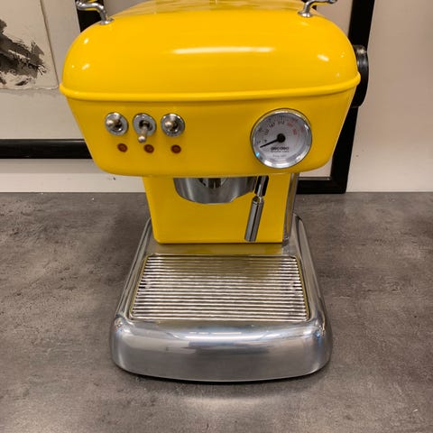 Mobil kaffevogn udstyret med espressomaskine. Velegnet til brug ved events, markeder eller udendørs servering. Vognen har en åben bagklap og plads til opbevaring af kaffeudstyr og kopper.