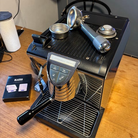 Nuova Simonelli Oscar espresso kaffemaskine med tilhørende kaffekværn. Medfølger en stamper. Alt virker men lækker lidt ved drypbakken. Skal afhentes.