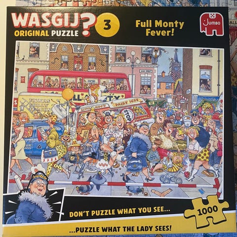 Jumbo Wasgij? 3 Full Monty Fever puslespil med 1000 brikker. Puslespillet udfordrer brugeren til at samle billedet ud fra en anden vinkel end den viste, hvilket giver en unik pusleoplevelse.