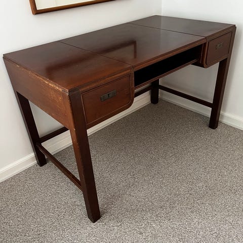 Fin gammelt mahogni skrivebord med 5 skuffer og et “hemmeligt” rum i bordpladen. Kan blive rigtig fint med nyt filt på bordpladen. Mange fine detaljer.