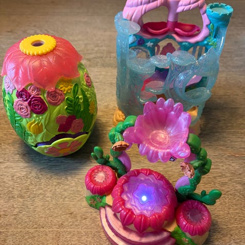 Autocamper med figurer og møbler. Den ene enhjørning mangler en vinge. Den kan foldes sammen med alt indeni. Den er ca. 23 cm lang.