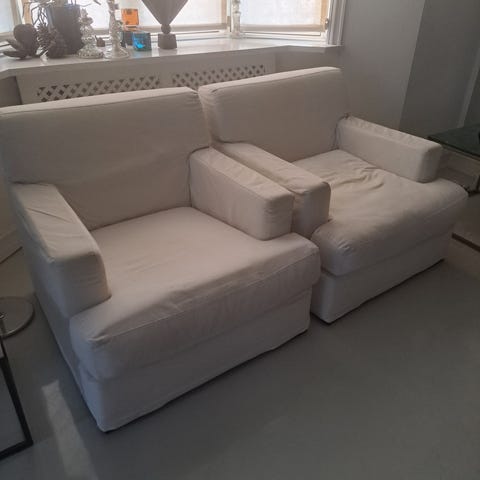 2 dejlige lænestole. Stof: hør og bomuldsblanding. Farven er changerende i grå/brun/blå.