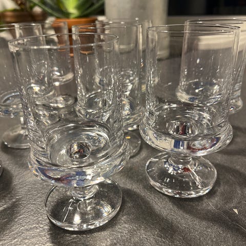 18 rødvinsglas, 12 hvidvinsglas og 12 portvin- eller snapseglas.