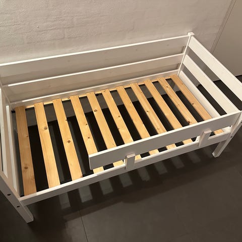 Hoppekids Juniorseng i træ med lamelbunde. Lys grå farve. Enkelte mærker, men god stand.