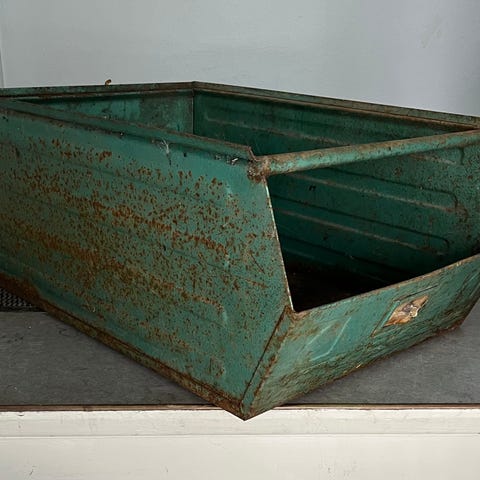 Industriel opbevaringskasse fra HM Bolte. Stærkt patineret, slidt, rå og charmerende - med metalbeslag. Har været gennem lidt af hvert. Mål: lxbxh: 50x35x21. Kan hentes i Kbh/Rådhuspladsen eller i Odense M elle sendes gerne.