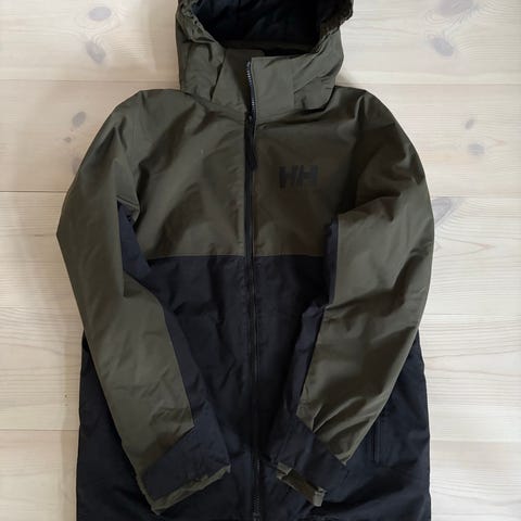 Helly Hansen JR Traverse skijakke i størrelse 152/12 år. Sort/mørkegrøn og orange detalje på hætten. Primaloft isolering. Hætten er aftagelig. Sneskørt og lomme til liftkort. Røgfrit hjem.