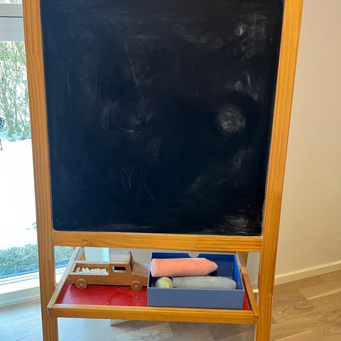 IKEA Børnetavle med træramme, sort tavleflade og rød bakke til opbevaring. Velegnet til børn til tegning og skrivning.