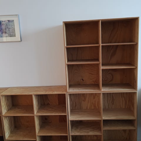 Fine trækasser i forskellige størrelser sat sammen til en reol. Kan skilles ad igen, ligesom fødderne kan skrues af.