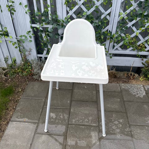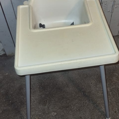IKEA børnemøbler med hvid plastik bakke. Bakken er designet til børn og kan bruges som en del af børnemøbler. Materialet er plastik. Højstol, alt fungerer